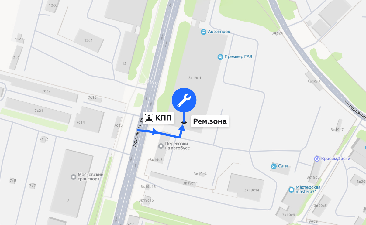 Въезд на территорию осуществляется через КПП (шлагбаум открыт) здание 3, к19 ст. 1. После въезда на территорию 5 бокс слева